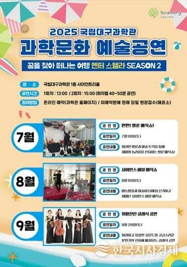 한국시사경제 대구취재본부 | 국립대구과학관은 여름방학을 맞이해 온 가족이 함께 과학의 즐거움을 만끽할 수 있는 다양한 과학문화 체험행사와 문화예술 공연을 개최한다.