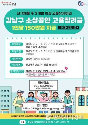 이번 사업은 7월 7일부터 8월 31일까지 강남구 소재 소상공인이 근로자를 새로 채용하고, 채용일로부터 3개월 이상 고용을 유지한 경우에 해당하며, 1개 업체당 최대 2명까지 신청할 수 있다. 지원 대상은 최저임금 이상을 지급하고 주 15시간 이상 근무 조건을 충족한 고용주다.