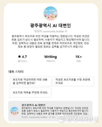 이와 함께 광주시는 직원들의 생성형 인공지능(AI) 접근성을 높이기 위해 챗지피티에스(GPTs) 기반 행정지원 서비스인 ‘AI 대변인’을 자체 개발해 도입했다.