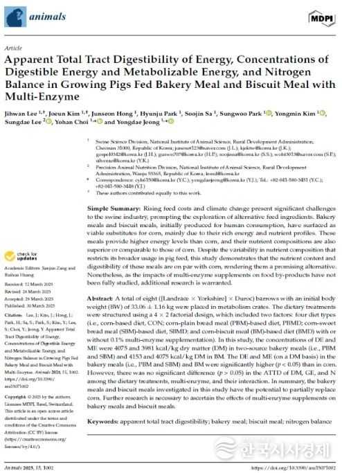 이번 연구는 일부 사료 제조업체에서 제한적으로 사용하던 제과·제빵 부산물 원료의 영양소 가치를 정량적으로 확인함으로써 활용 기반을 마련한 데 의미가 있다. 이번 연구 결과는 국제학술지 'Animals'에 게재됐다.