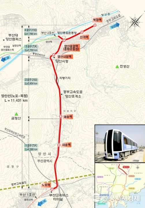 양산 도시철도는 부산 도시철도 1호선 노포역에서부터 양산 사송택지지구를 거쳐 북정동을 잇는 길이 11.43㎞, 정거장 7개, 차량기지 1개소, 총사업비 7,963억 원 건설사업으로, 부산 도시철도 2호선 양산역과도 연결된다.