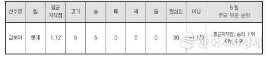지난 5월 롯데에 합류한 감보아는 6월 첫 등판인 사직 키움 전에서 7이닝 무실점, 승리투수가 되며 KBO 리그에 빠르게 적응했다. 이후 선발 등판한 4경기에서도 모두 승리하며 6월 한 달간 5승 무패를 기록, 승리 부문 1위에 올랐다.