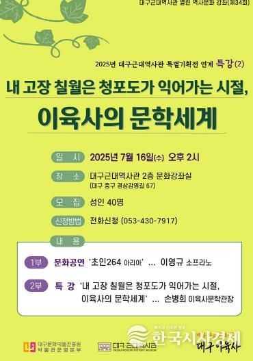 한국시사경제 대구취재본부 | (재)대구문화예술진흥원 박물관운영본부 소속 대구근대역사관은 광복 80주년 기념 특별기획전 ‘백마 타고 온 초인(超人), 대구 이육사’ 연계 행사로, 7월 16일 오후 2시, ‘내 고장 칠월은 청포도가 익어가는 시절, 이육사의 문학세계’ 문화공연과 특강을 개최한다.