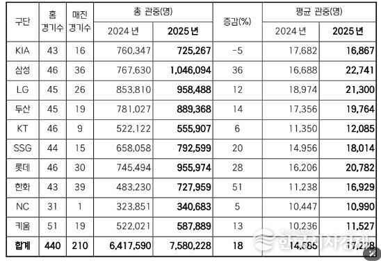 팬들의 뜨거운 열기로 2025 KBO 리그는 관중 관련 기록을 연일 경신하고 있다. KBO리그는 지난 7월 2일 역대 최초로 700만 관중을 달성했다. 종전 전반기 최다 관중 기록은 2024 시즌 418경기에서 달성한 605만 7,323명, 2025시즌 전반기는 440경기에서 총 758만 228명의 관중이 입장하며 평균 관중 17,228명을 기록했다. 특히 210경기가 매진되며 전반기 440경기의 약 47.7%를 만원 관중 앞에서 치렀다. 전반기 KBO 리그의 좌석 점유율은 83.6% 이다.