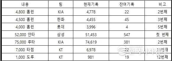 한국시사경제 스포츠팀 | 선수들과 팬이 어우러져 하나가 됐던2025 신한 SOL뱅크 KBO 올스타전의 성공적인 개최를 뒤로하고, KBO 리그 후반기가 7월 17일(목)부터 시작한다. 치열한 순위 다툼 와중에도, 빛을 발할 수 있을 것으로 예상되는 대기록들은 다음과 같다.