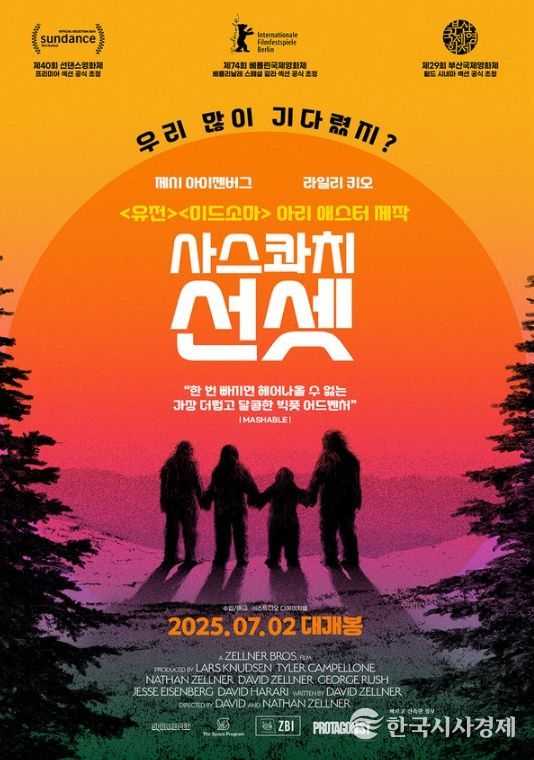 한국시사경제 연예팀 | '유전''미드소마' 아리 애스터 감독이 총괄 프로듀서로 참여했으며, 선댄스, 베를린, SXSW, 부산을 발칵 뒤집은 귀여운 문제작 '사스콰치 선셋'이 7월 16일(수) 바로 오늘부터 극장 동시 IPTV & VOD 서비스를 시작한다.[감독: 데이비드 젤너, 나단 젤너 | 제작: 아리 애스터 | 출연: 제시 아이젠버그, 라일리 키오, 나단 젤너, 크리스토프 자야츠 데넥 | 장르: 코미디, 어드벤처 | 수입/배급: ㈜스튜디오 디에이치엘]