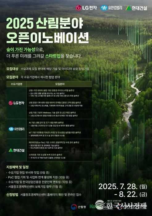 한국시사경제 김숙영 기자 | 산림청은 오는 7월 28일부터 8월 22일까지 산림 분야 공공데이터와 인공지능(AI) 기술을 활용한 혁신적인 신제품 및 아이디어 상품 개발을 목표로 오픈이노베이션 사업 공모전을 개최한다고 밝혔다.