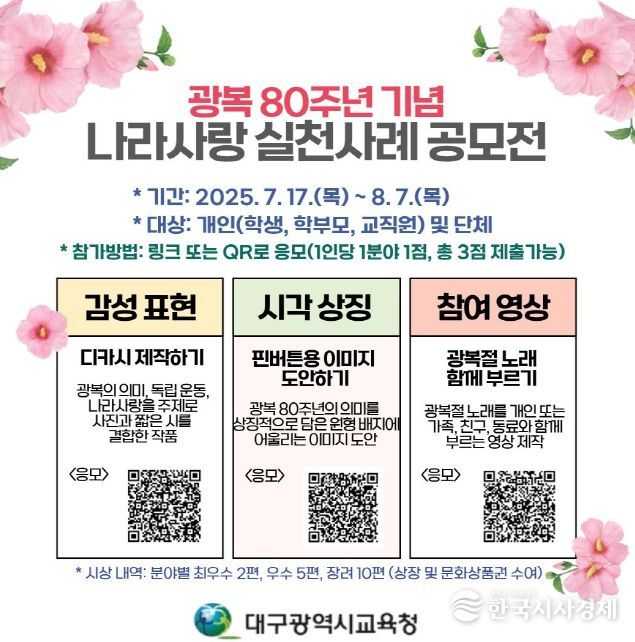 한국시사경제 대구취재본부 | 대구시교육청은 광복 80주년을 맞이하여 그날의 역사적 의미를 되새기고, 교육공동체가 생활 속에서 나라사랑을 실천할 수 있도록 ‘광복 80주년 기념 나라사랑 실천사례 공모전’을 운영한다.