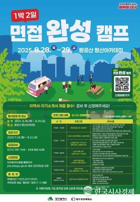 한국시사경제 대구취재본부 | 대구광역시는 오는 8월 28일부터 29일까지 양일간 팔공산 평산아카데미에서 지역 청년 40명을 대상으로 ‘1박 2일 면접 완성 캠프’를 개최한다.