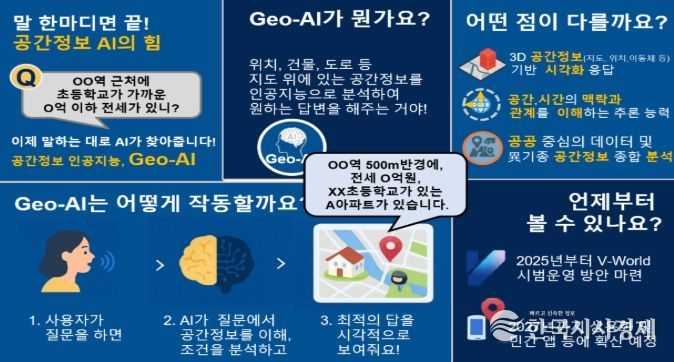 Geo-AI는 공간정보에 특화된 인공지능 기술로서 텍스트 분석을 넘어 공간적(지도·건물·교통 등), 시간적(과거·현재·미래 등) 요소까지 AI가 이해·분석하여 최적의 응답을 제시하며, 챗봇형 AI와는 크게 3가지 차별성이 있다.