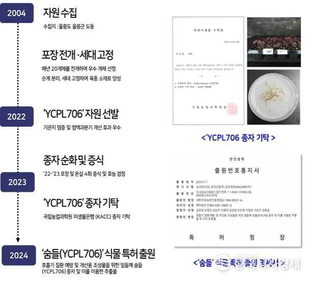 ‘숨들’은 ‘숨쉬기 편하게 하는 들깨’라는 의미를 담고 있다. 농촌진흥청은 국내 약 200종의 잎들깨 자원에서 호흡기 건강개선 효과가 뛰어난 자원 56종을 1차 선발하고, 대량검정으로 미세먼지에 대한 세포 보호 효과가 우수하면서도 염증 및 점액 과분비를 효과적으로 개선하는 자원으로 최종 선발한 잎들깨를 식물특허로 육성했다.