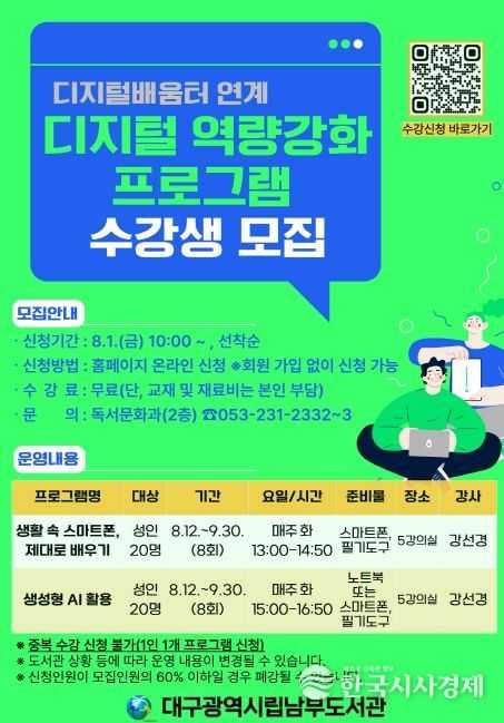 한국시사경제 대구취재본부 | 대구남부도서관은 지역주민의 디지털 정보 격차를 줄이고, 디지털 환경을 접할 수 있는 다양한 기회를 제공하기 위해 8~9월 ‘시민 디지털 역량강화 프로그램’을 운영한다.