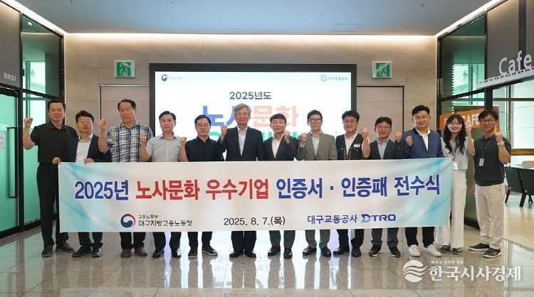한국시사경제 대구취재본부 | 대구교통공사는 고용노동부로부터 ‘2025 노사문화 우수기업’으로 선정됨에 따라 지난 7일(목) 공사 본사에서 ‘노사문화 우수기업 인증서·인증패’ 전수식 행사를 진행했다.