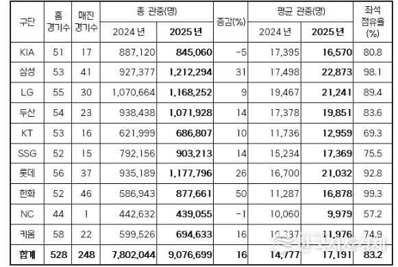 이로써 오늘 경기까지 누적 관중 907만 6,699명을 기록해 528경기만에 900만 관중을 넘어서며 작년의 610경기만의 900만 관중 달성 기록을 82경기 단축했다. KBO 리그 전체 좌석 점유율은 83.2%를 기록 중이다.