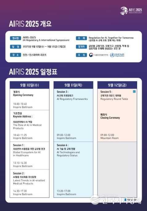한국시사경제 해외팀 | 식품의약품안전처는 세계보건기구(WHO)와 ‘글로벌 AI 규제조화, 함께 여는 미래’라는 주제로 9월 10일부터 12일까지 3일간 인천 인스파이어 호텔에서 개최하는 '국제 인공지능 의료제품 규제 심포지엄(AIRIS 2025)'의 사전등록 신청을 8월 11일부터 22일까지 받는다고 밝혔다.