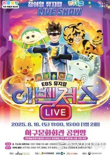 EBS 뮤지컬 ‘이벤져스 라이브’는 서구문화회관이 (재)예술경영지원센터 '2025년 공연예술 지역 유통지원 공모사업'에 선정된 공연으로 번개맨, 뿡뿡이, 야호, 뚝딱이, 뚜앙 등 오랜 시간 사랑을 받은 EBS 대표 캐릭터들이 하나의 무대에서 모험과 도전을 펼치는 뮤지컬이다.