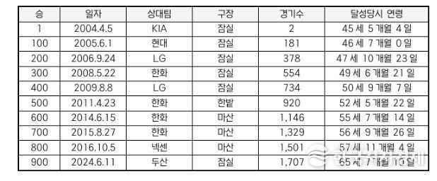 2024시즌 중 한화 감독에 선임되며 KBO 리그에 복귀한 김경문 감독은 2024년 6월 11일 잠실 두산전에서 자신의 통산 900번째 승을 달성한 바 있다.