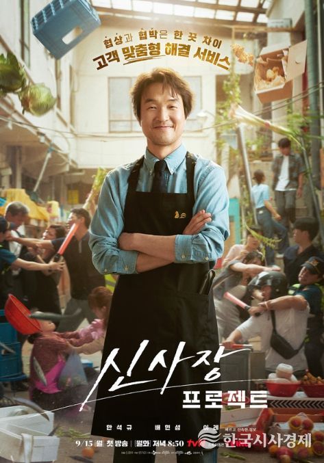 공개된 포스터 속 신사장은 셔츠와 넥타이, 그리고 검은 앞치마라는 이질적인 옷차림으로 시선을 사로잡는다. 앞치마를 두르고 동네 치킨집 사장님으로 일하다가도 분쟁이 생기면 곧바로 앞치마를 벗어 던진 채 협상가 모드로 전환할 준비가 되어 있어 신사장의 반전 매력을 궁금케 한다.