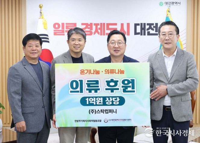 스탁컴퍼니는 14일 대전시청에서 한밭주거복지사회적협동조합에 1억 원 상당의 의류와 잡화를 기탁했다. 이날 기탁식에는 이장우 대전광역시장을 비롯해 이영선 스탁컴퍼니 대표, 이창섭 한밭주거복지사회적협동조합 대표, 김현호 대전광역시자원봉사센터장이 참석했다.
