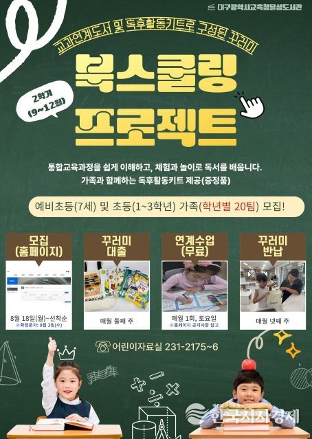 한국시사경제 대구취재본부 | 대구달성도서관은 9월부터 12월까지 창의적 사고력과 공동체 역량을 키우는 독서활동 꾸러미 프로그램 ‘북스쿨링’을 운영한다.