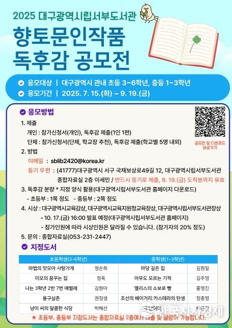 한국시사경제 대구취재본부 | 대구서부도서관은 초등 3학년 학생부터 중학생을 대상으로 ‘향토문인작품 독후감상문 공모전’을 개최한다.