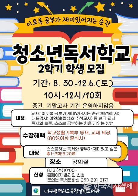 한국시사경제 대구취재본부 | 대구달성도서관은 오는 8월 30일부터 12월 6일까지 중학생 독서학교 ‘이토록 공부가 재밌어지는 순간!’을 운영한다.