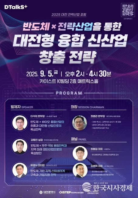 한국시사경제 김숙영 기자 | 대전시는 대전과학산업진흥원(DiSTEP)과 함께 오는 9월 5일 오후 2시 카이스트 KI빌딩 2층 매트릭스홀에서 '2025 대전 전략산업 포럼–반도체산업'을 개최한다.