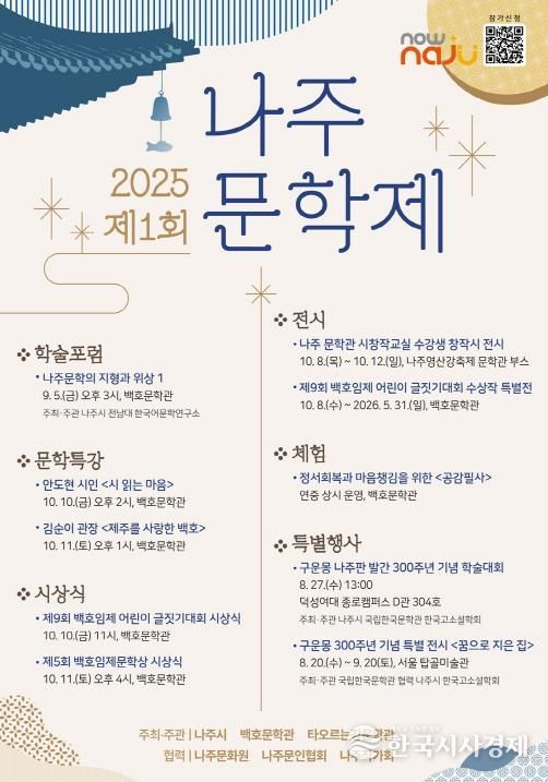 한국시사경제 권충현 기자 | 전라남도 나주시가 문학 진흥과 관광 활성화를 위해 오는 9월부터 10월까지 제1회 나주문학제를 개최하고 학술포럼과 특강, 문학상 시상식, 전시 등 다채로운 프로그램으로 나주문학의 위상과 가치를 널리 알린다.