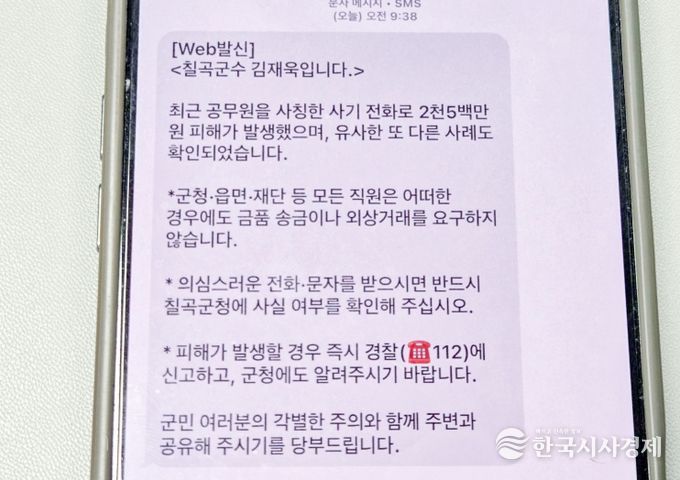 한국시사경제 한장선 객원기자 | 칠곡군이 공무원 사칭 사기 피해 예방을 위해 지난 6월부터 지속적으로 안내와 홍보에 나선 가운데, 최근 실제 피해가 발생하자 긴급 대응에 돌입했다.