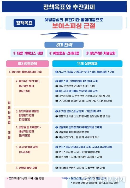 이에 정부는 지난 8월28일 국무조정실 주관의 범정부 전담반(T/F) 회의를 개최하여 ‘사기전화(보이스피싱) 근절 종합대책’을 발표하고, 범죄 수단을 확보하는 단계에서 피해자에게 금전 탈취를 시도하는 단계까지 사기전화(보이스피싱) 범죄가 이루어지는 전 단계에 걸쳐 사기전화(보이스피싱) 근절을 위한 15대 실천과제를 발표하였다.