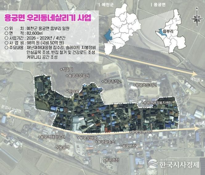 이번 사업은 ‘용을 품은 용궁면의 다시 찾은 봄날, 회룡회춘 용궁’을 비전으로 2026년부터 2029년까지 4년간 추진되며, 총 98억 원이 투입된다.