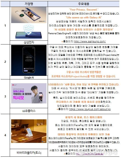 삼성전자 ‘녹스 볼트 플랫폼’, LG 유플러스 ‘익시오’, 구글 AI ‘아스트라 프로젝트’, 토스 ‘페이스페이’, 룰루메딕 ‘해외 연동형 의료 마이데이터 플랫폼’, 메디에이지 ‘생체나이 서비스’, 딥브레인에이아이 ‘AI 딥페이크 식별’, 플리토 ‘1:1 실시간 통역 솔루션’ 등 8개 기업의 기술을 현장에서 체험해볼 수 있다.