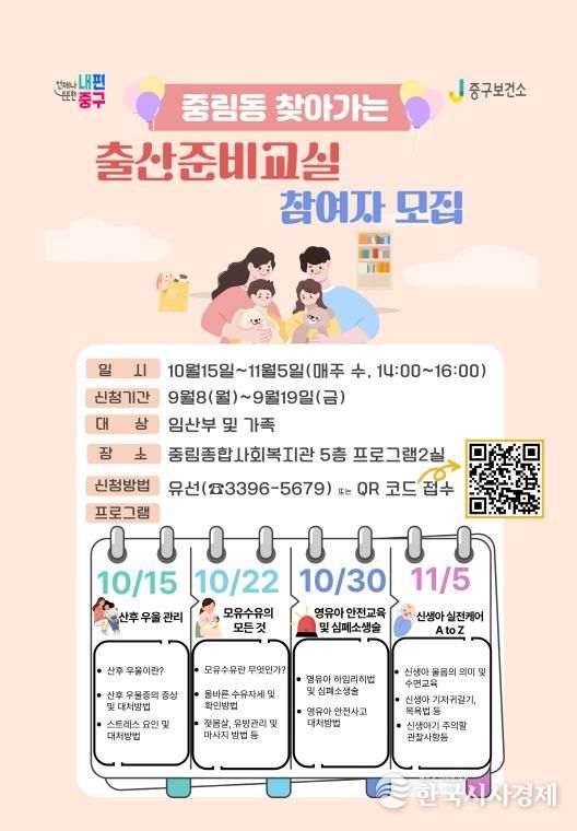한국시사경제 한장선 객원기자 | 서울 중구가 10월 15일부터 11월 5일까지 매주 수요일 오후 2시 중림동에서 '찾아가는 출산준비교실'을 운영한다.