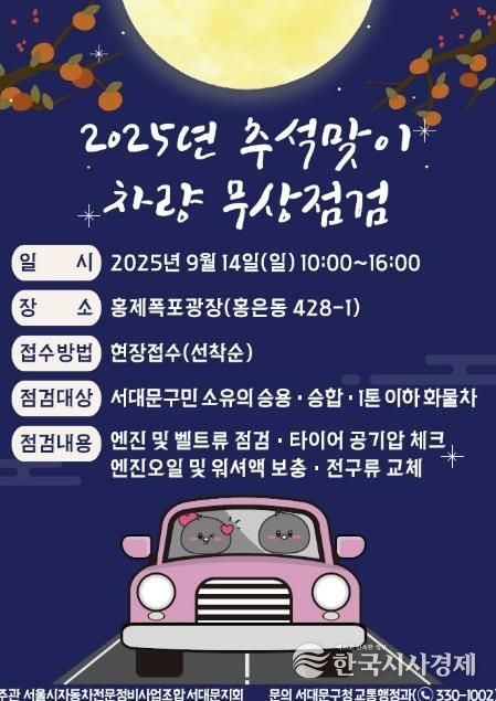 한국시사경제 한장선 객원기자 | 서대문구가 명절을 맞는 구민들의 안전한 차량 이용을 위해 ‘서울시 자동차전문정비사업조합 서대문지회’와 함께 ‘2025년 추석맞이 차량 무상점검’을 실시한다.