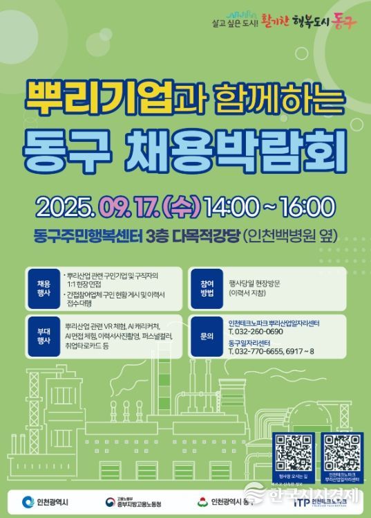 한국시사경제 경제팀 | 인천 동구는 오는 17일 주민행복센터 3층에서‘2025년 뿌리기업과 함께하는 동구 채용박람회’를 개최한다고 밝혔다.