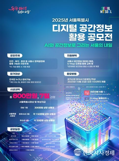 이번 공모전은 ‘AI와 공간정보로 그리는 서울의 내일’을 주제로, 오는 9월 22일부터 10월 3일까지 참가 신청을 받는다. 이후 10월 6일부터 11월 3일까지 응모작 접수를 진행하고, 본선 발표와 시상식은 11월 25일에 이뤄진다.