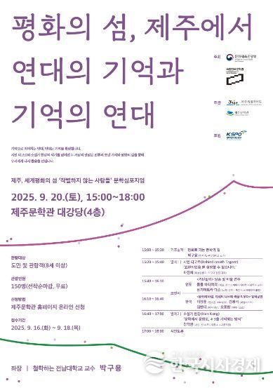 한국시사경제 한장선 객원기자 | 제주문학관이 19일부터 25일까지 ‘제주, 세계평화의 섬 – 작별하지 않는 사람들’ 문학행사를 개최한다. 2025 대한민국 문학축제와 연계한 이번 행사는 제주가 ‘세계평화의 섬’으로 지정된 지 20주년을 맞아 기획됐다.