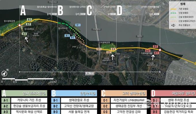 또한, 구는 암사생태공원에서 가래여울마을까지 4개 구간(A~D 구간)으로 나누어, 각 구간의 특성과 강점을 살린 전략으로 12개 실행 과제를 수립했다.