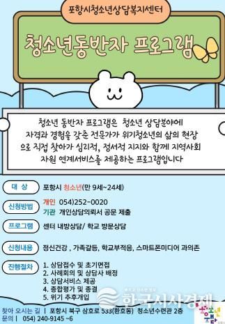 한국시사경제 한장선 객원기자 | 포항시청소년재단 청소년상담복지센터는 2025년에도 지역 내 고위기 청소년을 대상으로 하는 ‘청소년동반자 프로그램’을 연중 운영하며, 찾아가는 상담 지원을 이어간다고 밝혔다.