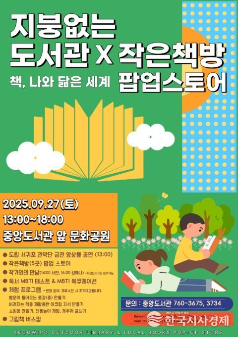 한국시사경제 한장선 객원기자 | 서귀포시도서관운영사무소는 오는 9월 27일 오후 1시부터 6시까지 중앙도서관 및 문화공원에서 지역 책방이 참여하는 '로컬북스 팝업스토어'와 야외 독서문화 행사 '지붕없는 도서관'을 함께 개최한다.
