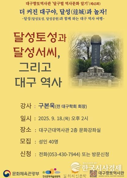 한국시사경제 대구취재본부 | (재)대구문화예술진흥원 박물관운영본부 소속 대구향토역사관은 9월에 달성토성과 달성서씨, 대구 역사를 주제로 ‘달구벌 역사문화 알기’ 특강과 답사를 2회 개최한다.