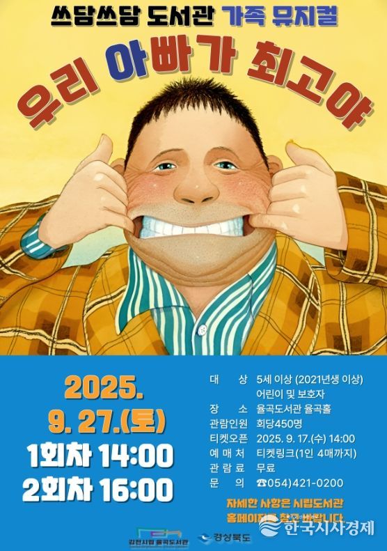 한국시사경제 한장선 객원기자 | 김천시립 율곡도서관은 오는 9월 27일 토요일 오후 2시와 4시, 두 차례에 걸쳐 율곡도서관 율곡홀에서 가족 뮤지컬 '우리 아빠가 최고야'를 공연한다고 밝혔다.
