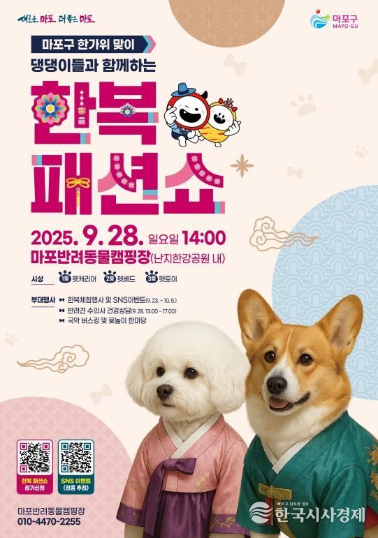 마포반려동물캠핑장이 주최·주관하는 ‘댕댕이 한복 패션쇼’는 사랑스러운 반려견들이 한복을 곱게 차려입고 가족과 함께 즐기는 행사로, 9월 28일 오후 2시에 개최될 예정이다.