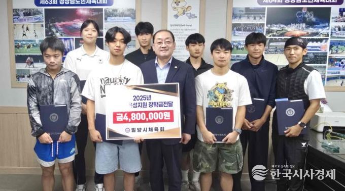 한국시사경제 윤경수 기자 | 밀양시체육회는 체육회장실에서 밀양지역 초·중학교를 졸업한 체육 유망주 8명에게 꿈나무 육성지원 장학금을 전달했다고 15일 밝혔다.