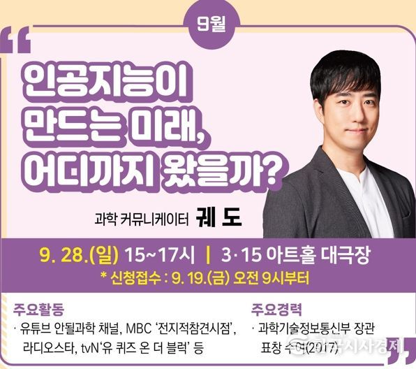 이번 강연은 “인공지능이 만드는 미래, 어디까지 왔을까?”라는 주제로, 빠르게 발전하는 인공지능(AI) 기술이 사회와 일상에 미치는 영향과 앞으로 우리가 준비해야 할 과제에 대해 시민들과 함께 고민하고 소통하는 시간을 마련할 예정이다.