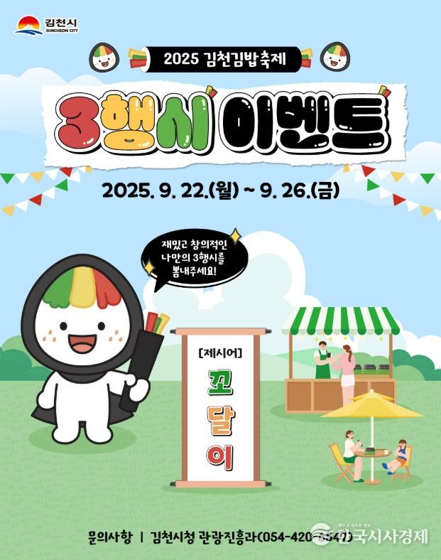 한국시사경제 한장선 객원기자 | 김천시는 오는 10월 25일부터 26까지 이틀간 열리는 『2025 김천김밥축제』의 분위기를 조성하고 홍보하기 위해 ‘김밥축제 캐릭터 꼬달이 삼행시 짓기 이벤트’를 개최한다.