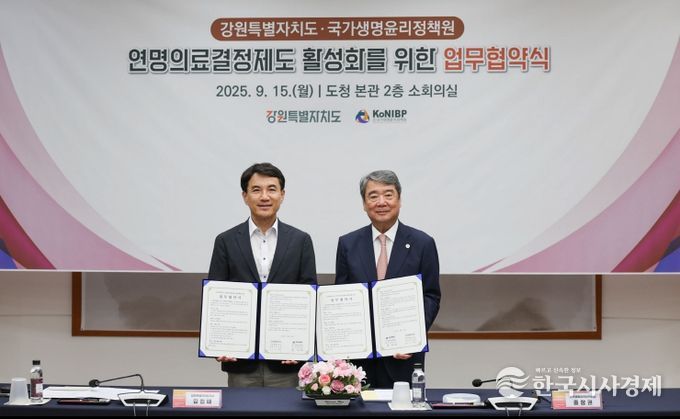 한국시사경제 윤경수 기자 | 강원특별자치도는 9월 15일 오후 2시 30분 본관 소회의실에서 국가생명윤리정책원(원장 홍창권)과 연명의료결정제도 활성화를 위한 업무협약(MOU)을 체결했다.