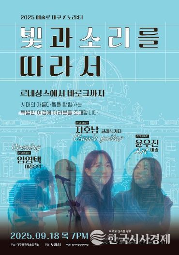 한국시사경제 대구취재본부 | 대구문화예술진흥원 문화예술본부는 ‘2025 예술인파견지원사업–예술로 대구’의 일환으로, 오는 9월 18일 복합문화공간 노리:터에서 기획공연 ‘빛과 소리를 따라서 – 르네상스에서 바로크까지’를 개최한다.