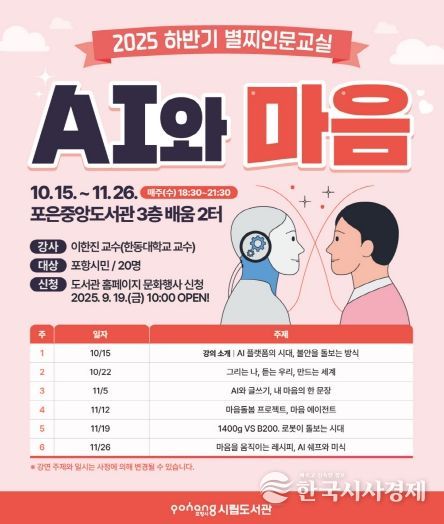 한국시사경제 한장선 객원기자 | 포항시립포은중앙도서관은 오는 10월 15일부터 11월 26일까지 매주 수요일 오후 6시 30분, 포은중앙도서관 3층 배움2터에서 이한진 한동대학교 교수를 초청해 ‘AI와 마음’을 주제로 한 2025 하반기 별찌인문교실을 운영한다.