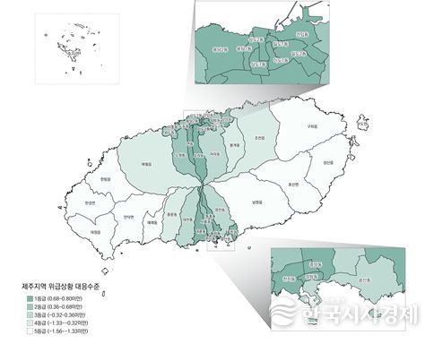 이번 연구에서는 ▲재난·사고 대응을 위한 119출동기관(5분 이내) ▲강력범죄 대응을 위한 112출동기관(5분 이내) ▲응급질환 치료를 위한 응급의료기관(15분 이내)까지의 접근성을 기준으로 '골든타임 서비스 권역'을 설정하고, 이 권역 내에 거주하는 인구 비율을 표준화하여 41개 읍면동(도로 데이터망이 구축되지 않은 추자면, 우도면은 분석 대상에서 제외)의 위급상황 대응수준을 분석했다.